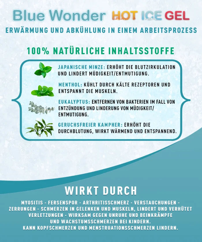 Blue Wonder ist ein natürliches Regenerationsgel, das dich nach dem Sport, bei Verspannungen oder einfach zwischendurch zuverlässig unterstützt. Es enthält sorgfältig ausgewählte, pflanzliche Inhaltsstoffe und sorgt für ein angenehm kühlendes Hautgefühl – ganz ohne künstliche Zusätze.